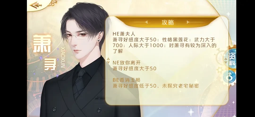 9、萧寻: HE萧夫人:萧寻好感度大于50;性格黑莲花;武力大于700;人际大于1000;