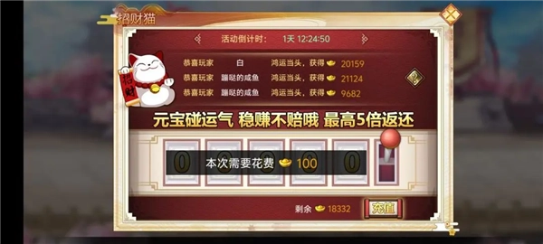 1、招财猫活动,每月一次,最高档位需要2.8万元宝启动。无VIP等级限制,攒够2.8万之前先不要花元宝。
