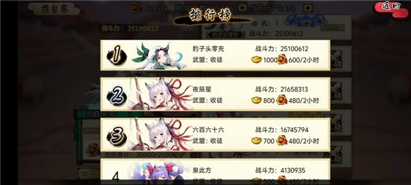 3、擂台赛每日可按排名领取元宝,可以买满次数尽量往上爬,排名越高元宝越多。有机会可以喊榜一让下位置拿个榜一称号。