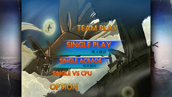 1、打开火影忍者究极风暴4手机版,进入游戏主界面,包括【TEAM PLAY】联机模式、【SINGLE PALY】单人模式、【SINGLE ACRADE】闯关模式和【SINGLE VS CPU】人机对战模式,玩家可自行选择,这里以【单人模式】为例,