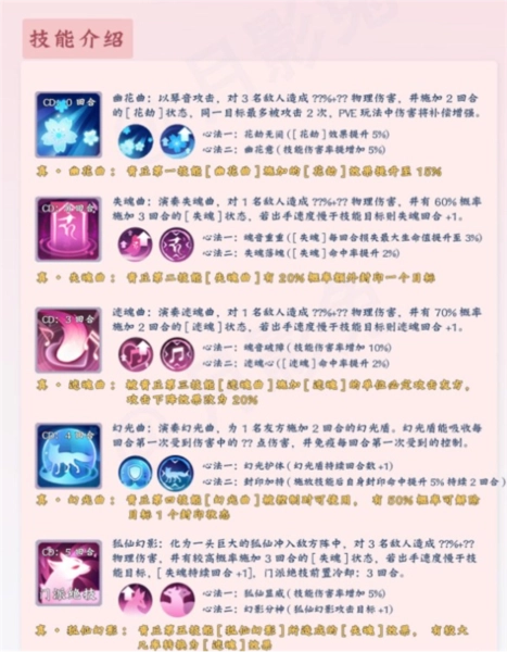 1、幽花曲:这个能让青丘在组队捉妖时更受欢迎,群攻技且可使目标受到伤害增加。