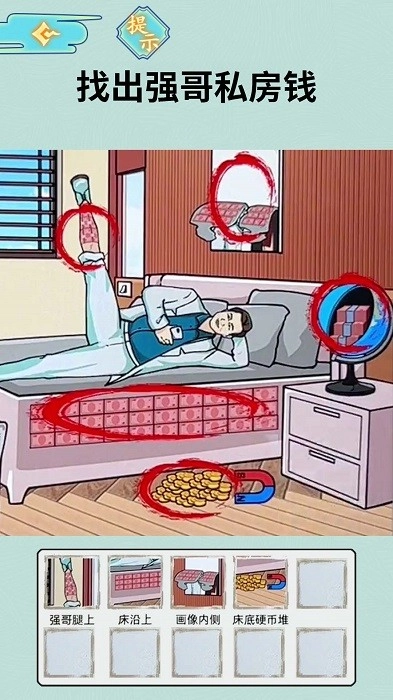 4、将放大镜移动到左边鞋子处,找到袜子里的私房钱,移动到右腿揭开膏药,找到私房钱