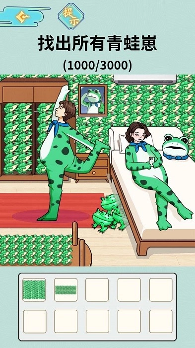 《奇葩找茬王》是一款休闲益智类的找茬小游戏,它集合了多款不同的找茬玩法。在游戏中,你需要根据给出的图片,找出所有隐藏其中的青蛙和跳舞小熊,并且按照任务要求凑齐对应的物品数量。现在就来开启你的慧眼,挑战这场趣味找茬吧!