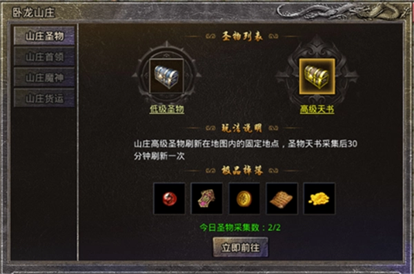 山庄高级圣物刷新在地图内的固定地点,圣物天书采集后30分钟刷新一次,采集后可以获得功勋,传奇币,技能书页,金币,高级天书有几率获得卧龙镖令,是押运高级镖车的材料