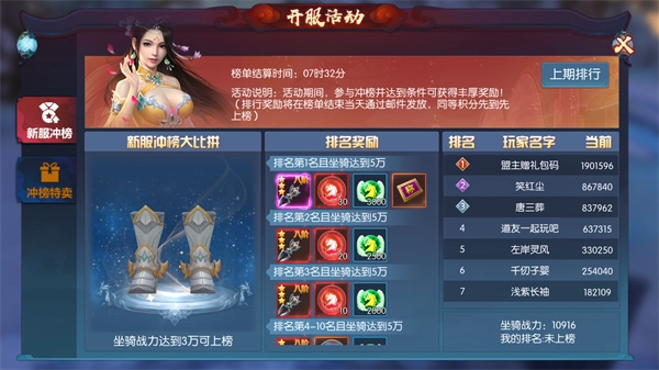 第一天冲榜活动,提升点为等级、属性、幻形,对应道具为经验丹、魂魄、幻形卡。获取魂魄优先级高,属性和幻形提升后根据竞争度买经验丹,提前冲榜,同阶先升阶排名靠前。