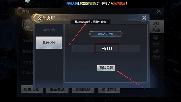 3、输入页面上方小编提供的礼包码,然后点击【确定兑换】,上方显示“礼包兑换成功,请邮件查收”即可;
