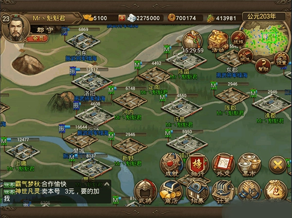 2、自由书写属于你的三国历史,发展城池、训练军队、扩张地盘,打造最强城池。