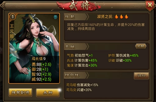晋武将们普遍防御值相对比较低,但这对恩爱夫妻组合可以减免大量伤害,十分耐打。司马昭发动技能可以对敌方后排造成300%的计策伤害,真是又肉又输出。王元姬的技能是给后排回血,还提升20%的伤害减免,啥也别说了,后排小伙伴请抱紧文明皇后娘娘大腿!