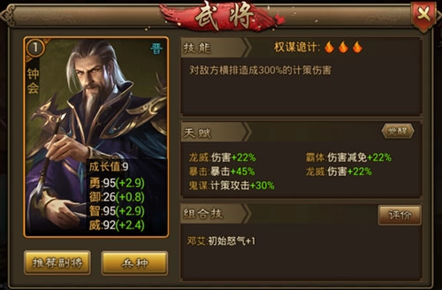 在名将录中,可查看各个阵营各个品级的武将,各个武将的成长值等各项属性、技能、可带兵种一目了然,让您在选择武将搭配阵容的时候更加轻松。