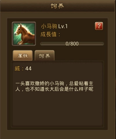4、来看看小马驹初始属性,小马驹在成为名驹前不能放生,成为名驹后可以通过升级来提升战力,也可以放生获得银两,有概率获得饲料和小马驹。