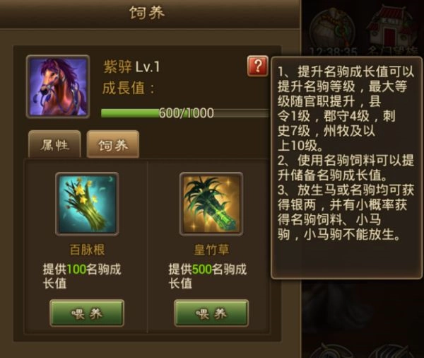 8、紫骍暂时升级到2级,会根据升级战力也会提升,所需的饲料也要更多,获取方式可以通过放生其他马概率获得或者可以到黑市里面随机刷新出来的饲料购买。