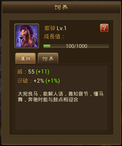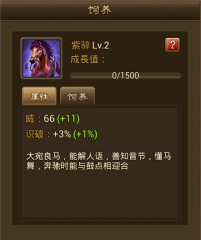 7、这里养成的是紫骍马,属于大宛良马,升级后的威力值也会上升,并且新增识破属性。不同名驹养成后的属性也都会有所不同,像玉追是策伤减免,的卢是物伤减免,里飞沙是物理伤害等等,可以根据马儿的属性搭配对应将士增强战力哦。