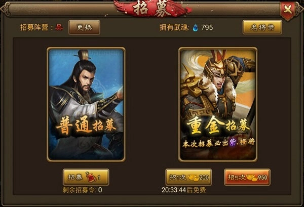 每24小时系统刷新一次免费重金招募的机会,想要免费得橙将的小伙伴可得好好把握机会。
