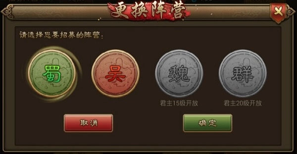 在您的阵营的武将足够多后,可选择更换招募其他阵营的武将,如果您选择的是蜀国,则系统会在君主等级10级,15级,20级的时候为您开放吴国,魏国,群雄阵营的招募。具体以您的阵营来定。