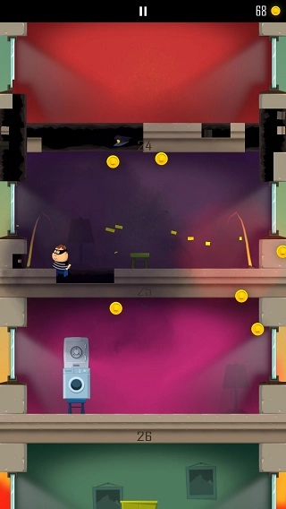 游戏内每个楼层的设计各不相同,具体表现在装饰的摆放,如冰箱、沙发、电视等基础家具,这些家具或将成为你逃脱时的得力帮手,亦有可能成为逃脱路上的绊脚石。操作技巧重点考验了玩家的反应力和想法,借助家具、家电的超强破坏力,持续获得更高分数,部分楼层的机关和保安岗哨,将成为你逃脱的最大危险,要小心应对!除此之外游戏内还有不同风格着装、道具以及强化功能,利用逃脱过程中收集的金币,解锁并升级你的能力,才有可能取得更高、更好的挑战成绩!
