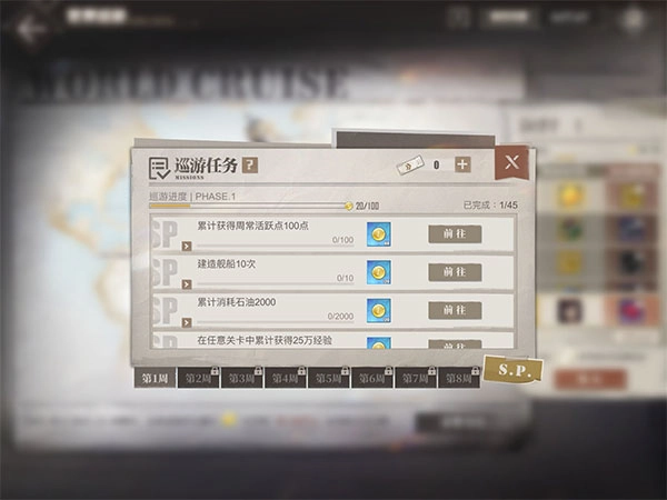 另一个则是S.P.任务,它是一组特殊任务,从活动开始后会直接处于全部解锁状态,它大部分都是累计任务,因为一开始任务就解锁了,所以玩家有两个月的时间来完成这些任务,难度算是很轻松了。巡游任务在解锁后后自动接取,满足任务完成条件时,会自动完成并获取对应奖励。
