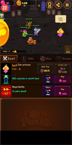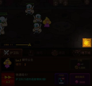 2、另外,为了方便玩家的操作,将以上画面向下滑动会弥留出一块空白区域,称之为控制区,点击便可让公主不断的产生硬币,搜集硬币,让勇士们不断升级,或者招募更多的勇士守卫公主,从而避免公主被捉,同时升级公主,还可以得到宝石作为奖励。