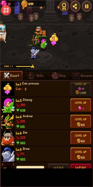 地下城是挂机的地方,在人不在的时候可以将护卫队派遣到里面去挂机获得金币。