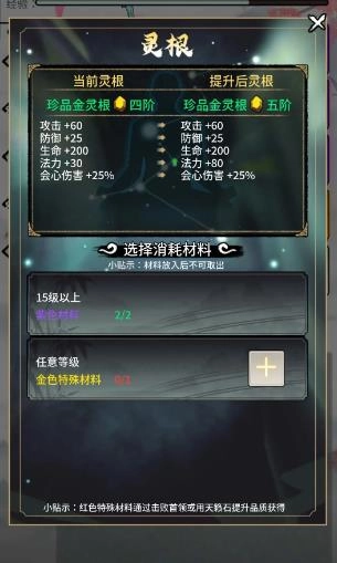然后是灵根升级先把自己现阶段的装备做出来完后再去用多余的材料升级灵根,前25级两个阶段做成橙色就好,没必要上红,35级这个阶段升级慢再打材料的时间长,再考虑红色。人物比如说事金属性,可以根据自己需要的装备磁条来确认自己需要什么系的装备,我现在发现的有金灵根搭配火属性装备可以称之为金火,金水的装备也有人用,根据自己的需求来确认装备。