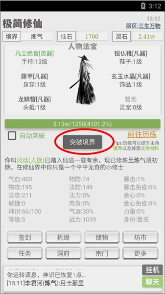 4、等人物的灵气积累到足够程度,便能突破当前境界,突破成功后会获得显著的提升。