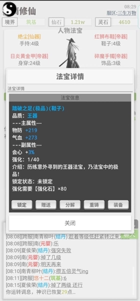 签到之后你会得到人生中第一件装备[灵器]凡尘绝音(装备品质:凡器<灵器<宝器<王器<皇器<帝器<仙器<神器)目前游戏里开放的最高就是神器,但最快也得一年多才能拿到(个人认为纪念意义大于实用意义)so,目前土豪氪佬用仙器,大佬贫民用帝器皇器。这块也是我建议为啥新人去一区的原因,一区的人在游戏里喊两句,就会有路过的大佬送装备(不像我刚开始穿了一身凡器,拿了把灵器在图二呆了一周)(目前装备穿戴有限制仙器需要筑基才能穿,神器则需要结丹,也就是每提升一个大境界则可以穿戴的装备品质就升了一层)