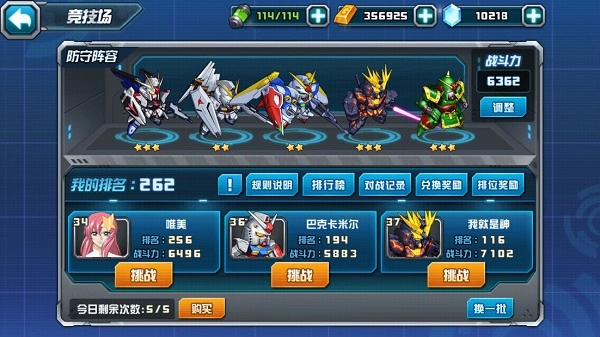 玩家可自行设置、调整防守阵容,每次系统推送3个对手供玩家选择,点击对手头像可以查看对方的阵容,再根据对方阵容选择自身上场机体;如果觉得3个对手都无法战胜的话,可以点击“换一批”来更换对手,玩家可以利用这一功能来增加胜率,取得更好的排名!