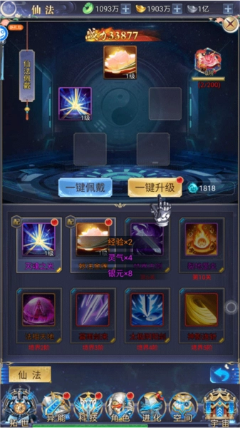 1、点击万道武神底部的“异能”一键升级技能,让你可以秒杀怪物。