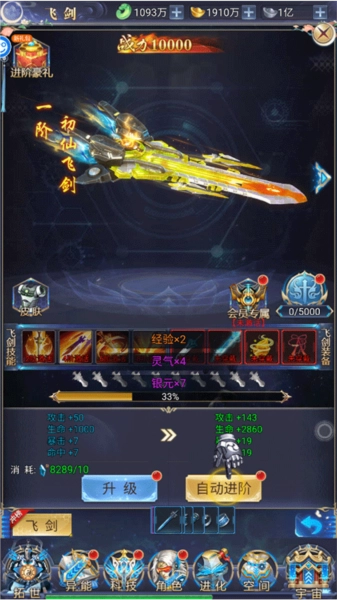 2、点击“科技”你能够在这里升级你的装备,也可以点击自动进阶进行升级。