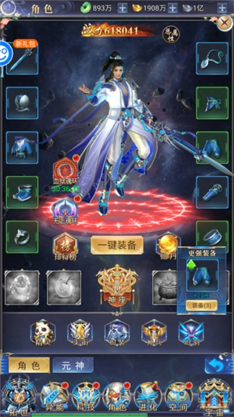 3、在角色页面,点击一键穿戴装备,升级角色装备,直接可以获得超高的战斗力。