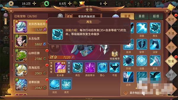 第二个推荐的是“再生”,再生这个技能是每次行动之后恢复血量的。既然是一个法术的宠物,那么在生存能力上是肯定很一般的。而再生每次行动之后都会回血,可以获得不错的容错率提升,实战效果是很强的。