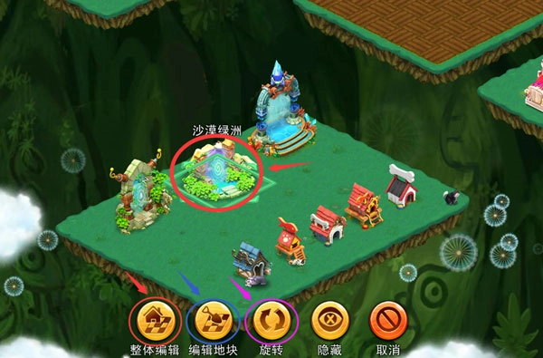 红色部分未开荒或者被占用,是不能编辑的。计算地块数量有助于你完美利用你的每一块土地。比如上图,犬窝占地1个格子,浪漫平原寻宝点占地六格。想要购买地块可以点击上图的“购买地块”,解锁云朵的时候多看看是不是赠送地块吧,接下来就是摆放物品了,具体摆放物品、编辑地形的方法如下: