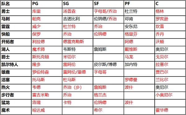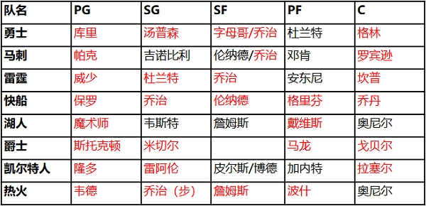 目前排在T0级别的战队有:勇士,热火,凯尔特人,马刺,湖人。