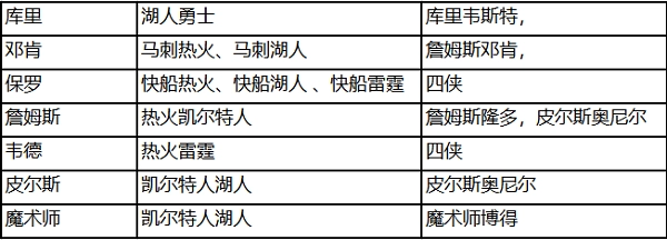 这里的链接球员有:库里(韦斯特),邓肯(詹姆斯),保罗(四侠),詹姆斯(四侠、邓肯、隆多)、韦德(四侠)、皮尔斯(奥尼尔)、魔术师(博得)。