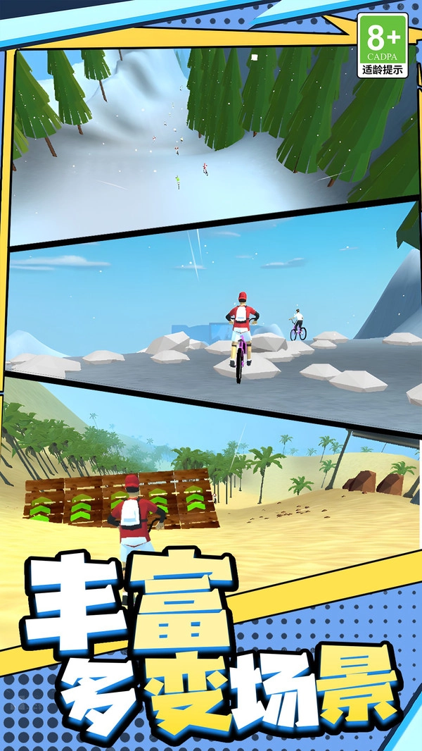 6、技巧组合丰富多元:可将冲刺加速、跳板飞跃等不同骑行技巧灵活搭配,提升策略性。