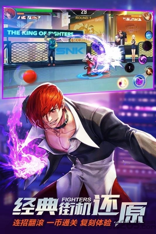 2、拳皇角色全收入,你记忆中的八门、玛丽、红丸等都完全还原,以最适配于移动端的灵活操作系统,手机端的热血格斗也是极致酷爽
