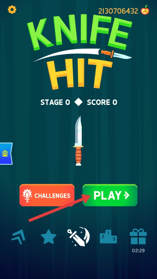 1、点击【PLAY】按钮启动游戏,进入飞刀挑战环节,通过不断闯关来逐步提升关卡等级。
