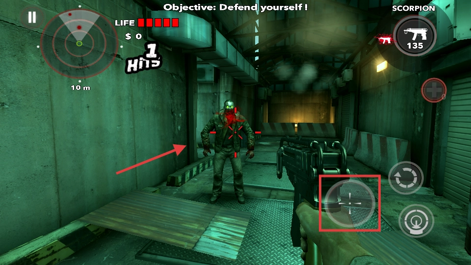 3、战斗时瞄准僵尸,通过射击按钮发起攻击,完成“自卫”目标,注意积累命中次数。
