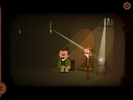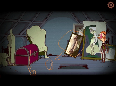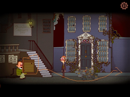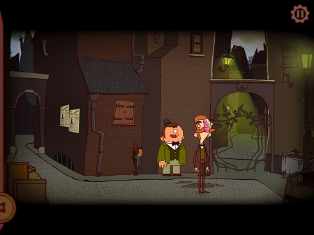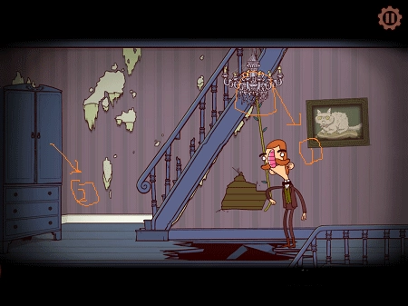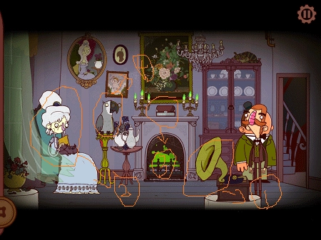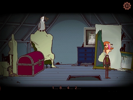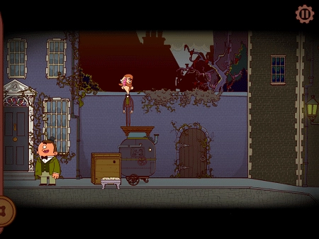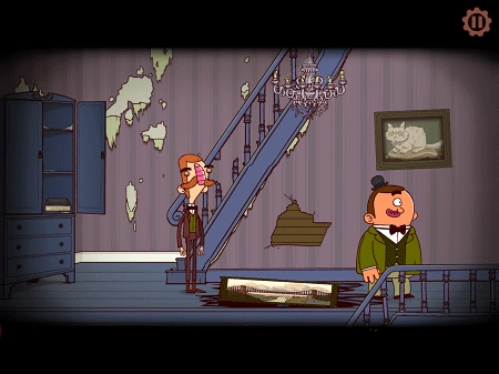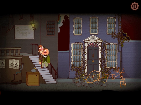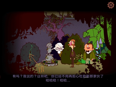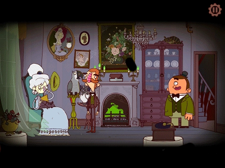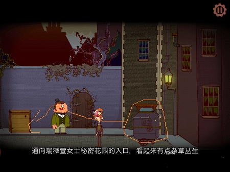 先拿到留音机上的喇叭,将它递给坐在椅子上的女士,这样她就可以听见费德说话了,接着拿到壁炉上盒子里的钻石。跟乌鸦对话后发现它饿了,你必须喂它吃的他才会跟你说秘密,这时候先出门。楼上的木板缺了一块没法前进调查,于是我们走出宅邸,再次来到街上。