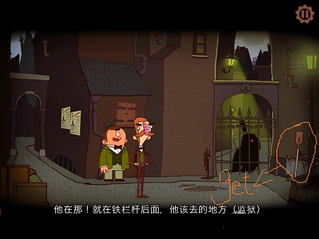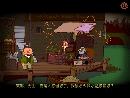 先用铁锹去够绳子上的那条巨大的内裤,将它收到口袋,接着扶起跌倒在地上的老爷爷(果真只有在游戏中才敢放心大胆的做好事~),得到他破损的眼镜片。最后敲门得知富马克伯爵的相关消息,便可继续向右移动到达下个地点。