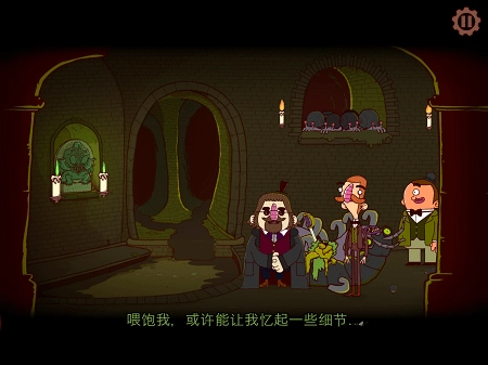 走进地窖里面,遇到富马克伯爵,将刚刚从水果摊贩那儿得到的谢礼食物喂给他得到线索和一把刀。