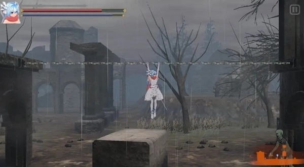 3、在分岔路选择下方道路绕过眼魔,继续前行至双锁链处向上跳跃进入屋子。