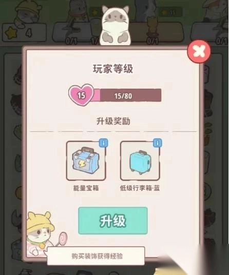 当经验值攒够,点击左上角的爱心即可升级!随着等级提升,能量宝箱、行李箱等珍稀道具等你来拿
