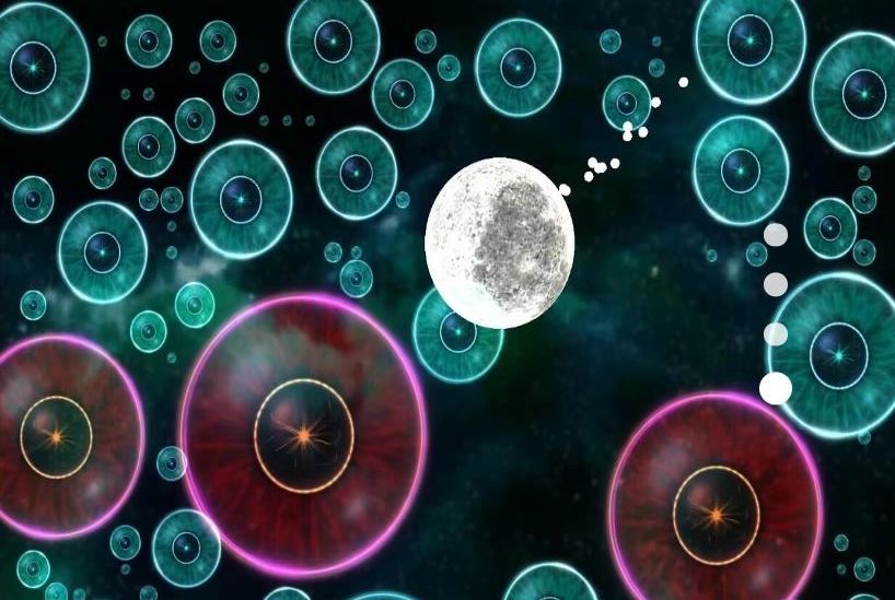 2、太空场景随时间动态变化,偶尔出现陨石群、引力漩涡等区域,利用环境可巧妙躲避捕食者。