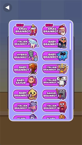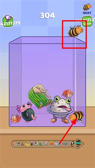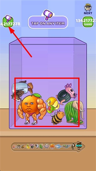 角色设计脑洞大开,从戴皇冠的小人,到长肌肉的橙子、仙人掌大象,每个角色都走奇葩反差路线,造型夸张搞笑,视觉上极具魔性吸引力,每一次合成都会带来新的奇葩惊喜。核心玩法是投放相同角色→合成新角色,操作仅需点击,逻辑简单易上手,但合成未知奇葩角色的期待感,搭配容器堆叠的视觉反馈,极易让人沉浸其中,形成停不下来的游玩节奏。紫色容器是固定的堆叠空间,投放、合成角色时需要考虑布局,既要让相同角色靠近方便合成,又要避免容器过早被堆满,让玩法多了一层策略性。合成角色会积累分数,分数达标后可解锁更多新角色元素,从基础蜜蜂、小人,到肌肉橙子、奇葩动物,解锁的角色越奇特,游玩的新鲜感越强。