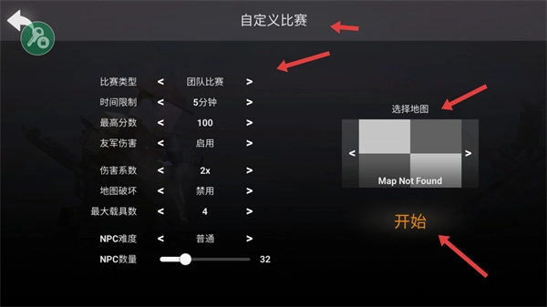 3、确认无误后,选择地图后点击“开始”进入战场。