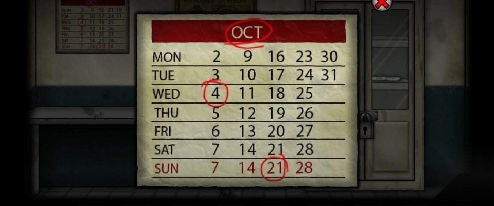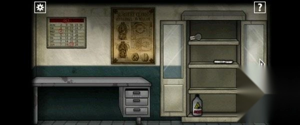 1、醒来后出门前往第四个房间(医务室),留意墙上的日历(OCT是十月的英文缩写),从中获取密码「10421」,随后输入该密码打开下方的抽屉,得到「一串钥匙」。