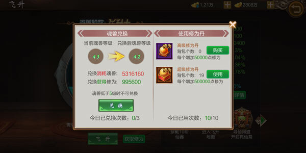 2、飞升系统的升级需要消耗飞升修为,而飞升修为可通过使用修为丹来获取修为值。