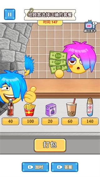 顾客会提出套餐组合需求,食物售价与钞票数额,从可乐、薯条、奶茶等多种品类中挑选正确组合,考验搭配计算能力。