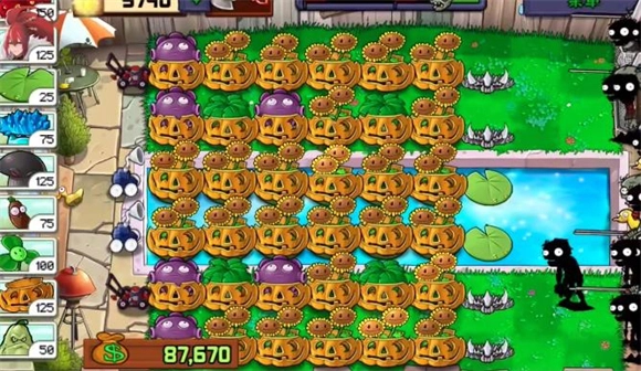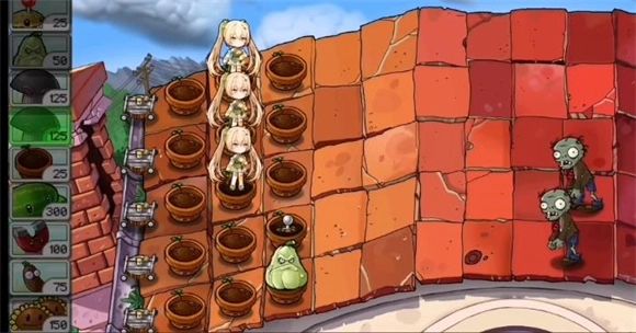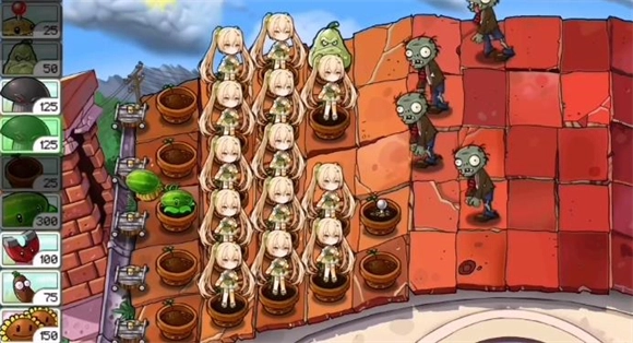 2、中期可以在后排种上一排忧郁菇,用来防止矿工偷家,然后尽可能多的种植双子向日葵,然后在将部分向日葵替换成叶子保护伞,用来放置飞贼僵尸。之后就是积累阳光了。