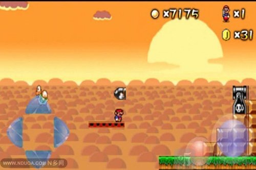 3.经典的超级玛丽完整保留了原始风格,屏幕左下方的上、下、左、右按钮负责控制方向,右下方的按钮则分别对应子弹发射与跳跃操作。